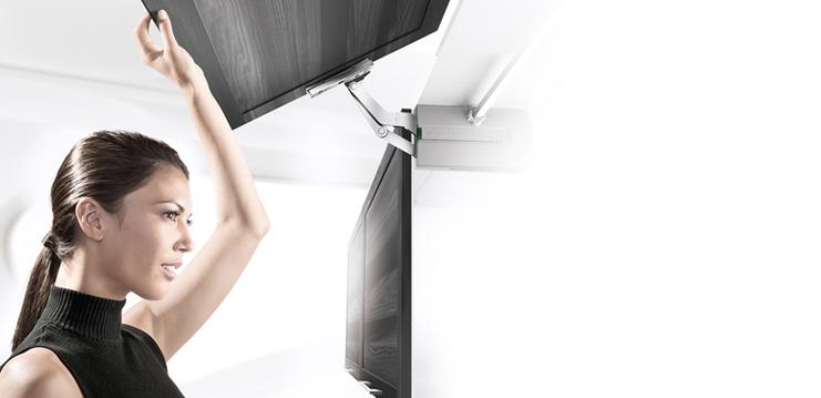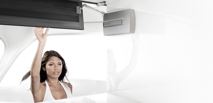 Mit der Kinvaro T-Serie bietet GRASS höchst funktionale und besonders komfortable Klappen-Systeme speziell für kleine und leichte Frontklappen. Die einteiligen Fronten lassen sich durch eine sanfte Drehbewegung bequem nach oben öffnen. Besonders beeindruckend ist dabei der außergewöhnlich elegante Bewegungsablauf. Und das integrierte, individuell einstellbare Soft-close Dämpfungs-System garantiert einen stets sanften und geräuschlosen Schließvorgang.